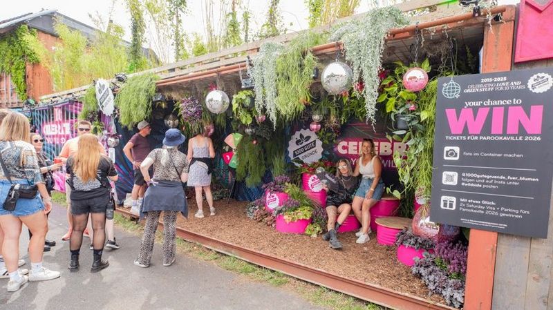 Vor dem Club-Container standen die „Citizen" der fiktiven Festivalstadt Schlange, um am Glücksrad Sofortgewinne mit Blumenbezug zu ergattern. Zum echten Shootingstar entwickelte sich dabei der „1000 gute Gründe"-Regenponcho. Geschmückt mit dem auffälligen Logo der Initiative hielt er über 2.000 Musikfans selbst beim Tanz im strömenden Regen trocken. Durchweg gut besucht war auch der Fotospot im Club-Container, an dem neben einem Erinnerungsfoto mit etwas Glück sogar schon Tickets für PAROOKAVILLE 2026 winkten.