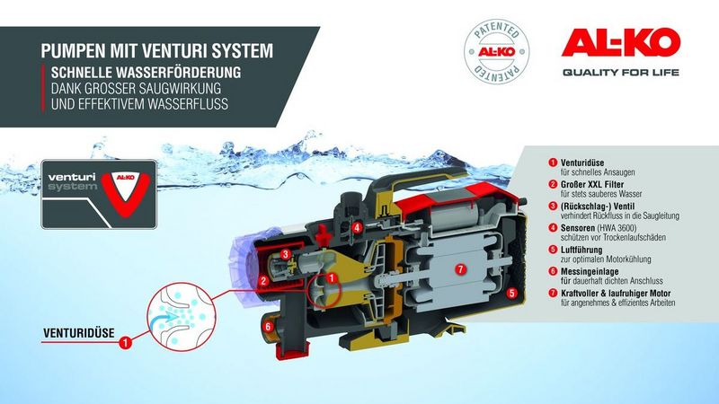 Die neuen AL-KO Bewässerungspumpen zeichnen sich durch modernste, innovative Technik in elegantem Design aus. Das integrierte Venturi System beschleunigt die Strömungsgeschwindigkeit des Wassers. Dadurch wird der Staudruck in der integrierten Düse erhöht. Durch den örtlich erzeugten Unterdruck wird Luft aus dem Saugschlauch gesaugt und dieser dadurch sehr schnell entlüftet. Die Folge: Der Ansaugvorgang erfolgt binnen kürzester Zeit, ohne den Saugschlauch zuvor mit Wasser füllen zu müssen. Der integrierte Trockenlaufschutz beim Modell HWA 3600 sichert die Pumpe zudem effektiv gegen mögliche Schäden bei Ausbleiben des Wassers. Der leicht zu reinigende, großvolumige, patentierte XXL-Filter sorgt zusätzlich für optimalen Schutz gegen Verunreinigung.