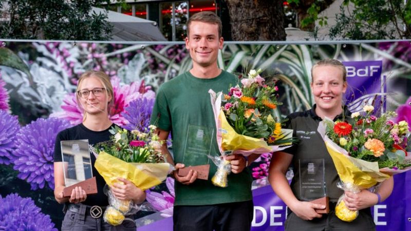Zusammen mit ZVG-Präsidentin Eva Kähler-Theuerkauf und Hannes Schrader, Botschafter der Gärtner und Floristen, der in diesem Jahr die Wahl zur Deutschen Blumenfee gewonnen hat, wurden die besten drei Friedhofsgärtner feierlich geehrt.