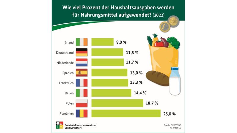 Auch im Vergleich mit unseren EU-Nachbarn sind die Ausgaben für Nahrungsmittel relativ gering. Nur in Irland (8,0%), Luxemburg (9,3%) und Österreich (10%) geben die Menschen anteilig weniger für Nahrungsmittel aus. Der EU-weite Durchschnitt liegt bei 13,6%. Besonders hoch fällt der Anteil in vielen (süd)osteuropäischen Staaten aus – allen voran Rumänien, wo die Menschen ein Viertel ihrer Haushaltsausgaben für Nahrungsmittel aufwenden.