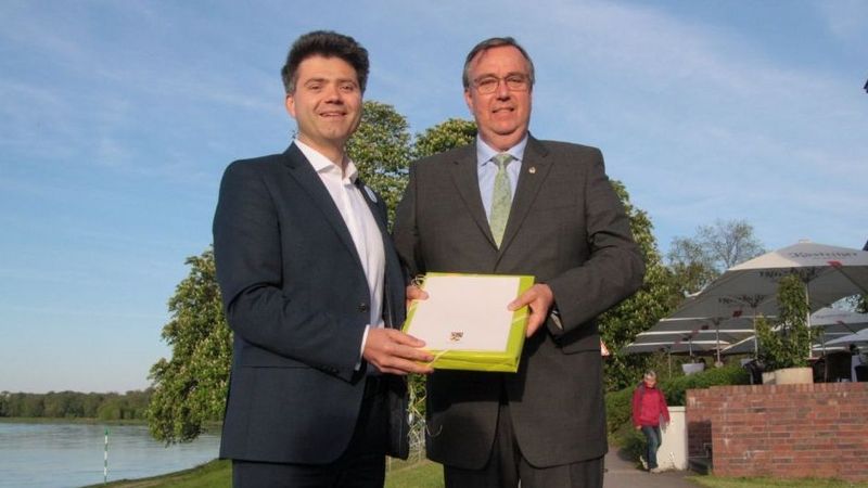 Im Mai übergab Dessau-Roßlaus Bürgermeister Dr. Robert Reck (l.) die Bewerbung zur Bundesgartenschau 2035 an Hajo Hinrichs, den Vorsitzenden der Gesellschafterversammlung der DBG. Nach eingehender Prüfung hat die DBG die Bewerbung nun offiziell angenommen. Bild: Deutsche Bundesgartenschau-Gesellschaft.