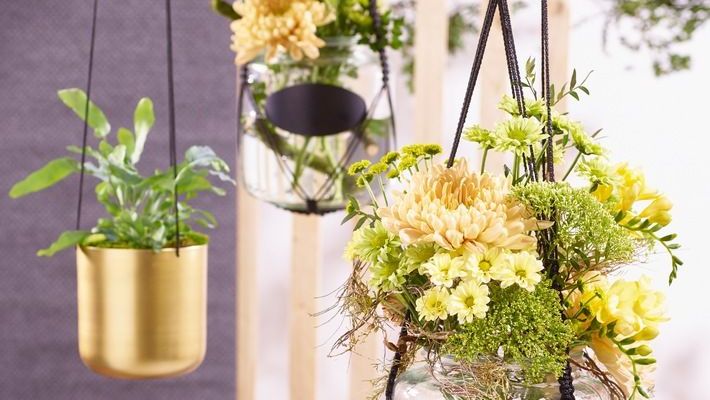 Insbesondere kleinere Chrysanthemen mit zahlreichen verzweigten Blütenstielen eignen sich bestens, um sich den Beginn der warmen Jahreszeit ins Interieur zu holen. Ein rundgebundenes Bouquet aus gefüllten und spinnenblütigen Chrysanthemen in frischem Weiß und Grün bekommt in einer schlichten Schale seinen großen Auftritt. Besondere Akzente setzen einzelne Blüten, die ohne Stiel in kleinen Schälchen mit ein wenig Wasser gesetzt werden. Besonders beeindruckend posiert die Chrysantheme in schwebenden Vasen. Für den frühlingshaften Look werden sonnengelbe Exemplare gemeinsam mit Freesien und etwas grünem Beiwerk zu einem lockeren Strauß gebunden. Für den hängenden Indoor-Garten kommt die Knüpftechnik Makramee zum Einsatz. Ein möglichst fester Bindfaden wird so verknotet, dass ein Gefäß sicher in der entstandenen Vorrichtung hängen kann. Besonders eindrucksvoll wirkt die Komposition, wenn die DIY-Vasen auf unterschiedlichen Höhen platziert werden. Grüne Akzente in goldenen Hängetöpfen runden das Gesamtbild ab, denn sie reflektieren Sonnenstrahlen und verteilen sie im gesamten Raum.