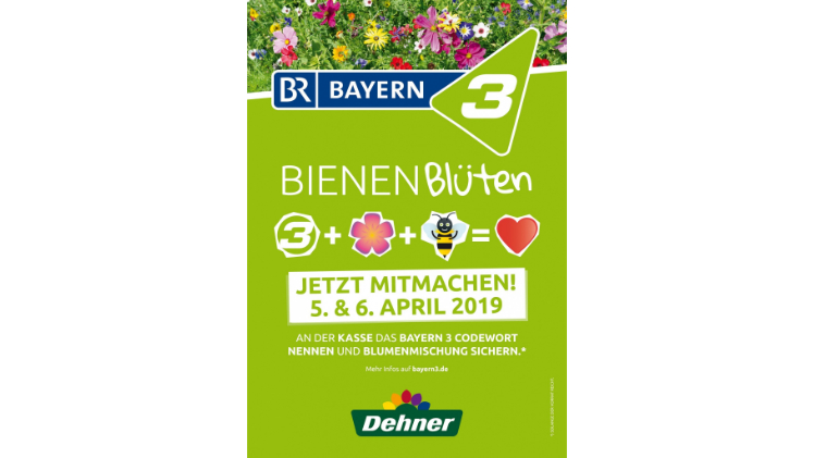 Win-Win-Aktion: Um aktiv auf die Notwendigkeit der Bienenrettung aufmerksam zu machen, gehen Dehner und BAYERN 3 eine nachhaltige Medienpartnerschaft ein und verschenken am 05. und 06. April 2019 die ‚BAYERN 3 Bienen-Blüten‘. Als Preisstifter stellt Dehner 10.000 Samentütchen mit insektenfreundlichen Blumenmischungen zur Verfügung. Aktions-Teilnehmer haben damit die Möglichkeit, Blumenwiesen anzulegen, die fehlende Blühflächen für Bienen schaffen und gleichzeitig Nahrung sowie Lebensraum für einheimische Schmetterlinge bieten. Die Blütenmischungen erhalten alle BAYERN 3 Hörerinnen und Hörer, die am 5. bzw. 6. April in einem der 40 bayerischen Dehner Märkten an der Kasse das richtige „Codewort“ nennen können, das BAYERN 3 im Vorfeld regelmäßig on Air kommuniziert.