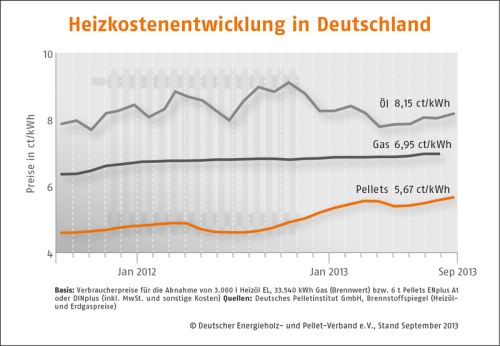 Regional ergeben sich unterschiedliche Preise für Holzpellets: In Nord- und Ostdeutschland ist der Preis für eine Tonne (t) Pellets bei einer Abnahmemenge von 6 t aktuell mit 270,64 EUR bundesweit am günstigsten. Pelletheizer in der Mitte der Republik zahlen für Qualitätspellets durchschnittlich 273,58 EUR pro Tonne, in Süddeutschland 280,25 EUR/t. Größere Mengen (26 t) wurden im September 2013 zu folgenden Konditionen gehandelt: Nord/Ost: 253,85 EUR/t, Mitte: 257,85 EUR/t, Süd: 267,79 EUR/t (alle inkl. MwSt.)