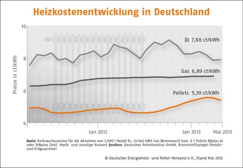 263,93 EUR/Tonne lautet der Preisindex des Deutschen Energieholz- und Pelletverbandes e.V. (DEPV) für den Mai 2013. Damit ist der Pelletpreis gegenüber dem Vormonat um rd. 2,6% rückläufig, gegenüber dem März 2013 sogar 3%. Laut DEPV kosten ein kg Holzpellets bundesweit durchschnittlich 0,26 EUR bzw. eine Kilowattstunde (kWh) Wärme aus Pellets 5,39 Ct. Gegenüber Heizöl (Preis Mai 2013: 0,84 EUR/Liter) beträgt der Kostenvorteil aktuell 31,7%. Der DEPV rät, die momentane Preissituation zeitnah zum Auffüllen der Lager zu nutzen.