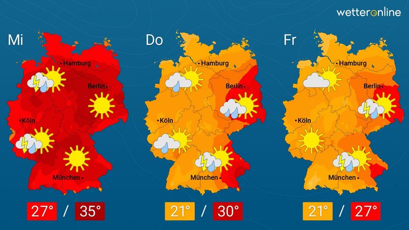 Zum Wochenende verabschiedet sich die Hitze vorübergehend auch aus den restlichen Landesteilen. Dabei gibt es meist einen freundlichen Wechsel aus Sonne, Wolken und einzelnen Schauern. Nur im Süden entwickeln sich in feuchter Luft häufiger Regengüsse mit Blitz und Donner. Die Höchstwerte liegen meist zwischen 20 und 25 Grad. (Quelle: WetterOnline)