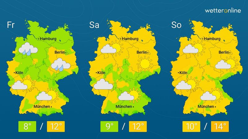 Am Freitag ziehen bei immer noch ruppigem Wind von der Küste her einige teils gewittrige Regengüsse südwärts. Hier und da sind auch Graupelgewitter dabei. Am Nachmittag erreichen sie eine Linie von Köln bis Berlin. An der Küste lockert es dann schon wieder auf. Auch im Süden lässt sich länger die Sonne blicken, am Alpenrand ist es anfangs noch nass. Die Höchstwerte erreichen nur noch um 10 Grad.