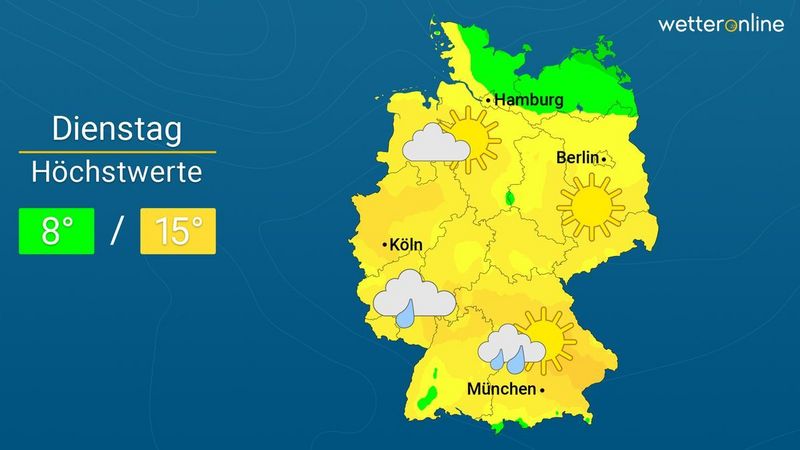 Am Dienstag entwickeln sich südlich einer Linie von der Kölner Bucht bis zum Erzgebirge einige Schauer oder Gewitter. Wolken lassen die Sonne nur selten durch. In der Nordhälfte bleibt es dagegen meist trocken und oft freundlich. Einzelne Schauer entwickeln sich unmittelbar an der Ostsee. Dort wird es unter 10 Grad kühl, ansonsten sind noch einmal 11 bis 15 Grad drin.