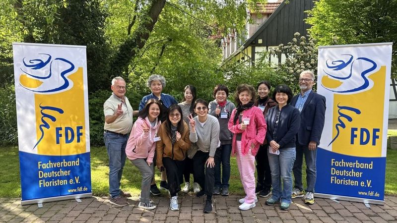 Sieben Floristinnen aus Taiwan haben am 30. Mai den internationalen Zertifikatslehrgang "FDF-Floral-Arrangeur" in der Bildungsstätte FloristPark erfolgreich abgeschlossen. Im Rahmen einer Feierstunde wurden ihnen die Zertifikate der IHK Nord Westfalen und des FDF offiziell überreicht. Die sieben Teilnehmerinnen waren von FDF-Referent Ulrich Klein in Taipeh/Taiwan und während eines fast dreiwöchigen Seminars in Gelsenkirchen auf die Abschlussprüfung vorbereitet worden. Kooperationspartner des Fachverband Deutscher Floristen e.V.-Bundesverband und der FDF-GmbH ist die International Floral Design Education Foundation in Taiwan unter Leitung der Direktorin Tsui-Hua Hsieh. Während der Abschlussprüfung vor den IHK-Prüfern Dorothee Kamp und Klaus Krielke arbeiteten die Taiwanerinnen praxisnahe blumige Werkstücke, die auch deutsche Florist*innen in ihren Abschlussprüfungen absolvieren: Sträuße, Gestecke, Pflanzungen und die Beiträge aus der komplexen Prüfungsaufgabe. Die schriftliche Prüfung hatte bereits am 26. Mai stattgefunden. Mit dem fachpraktischen Abschlusstest endete der Zertifikatslehrgang, der sich eng an den Inhalten der deutschen Ausbildung orientiert. Direktorin Tsui-Hua Hsieh, FDF-Vorstandsmitglied Michael Rhein und Fachreferent Ulrich Klein sprachen ihre herzlichen Glückwünsche aus, die von Dolmetscherin Chia-Yin Chen übersetzt wurden. Cornelia Scholz von der IHK Nord Westfalen lobte die guten Noten und die facettenreiche blumige Kreationen der Gäste. Während der Feierstunde bekräftigten FDF-Vorstandsmitglied Michael Rhein und Direktorin Tsui-Hua Hsieh die beidseitige Wertschätzung der internationalen Bildungs-Kooperation. Im August wird eine Gruppe von taiwanesischen Floral-Arrangeuren erwartet, die am Folge-Lehrgang "Floral-Stylist" im FloristPark teilnehmen. (FDF)