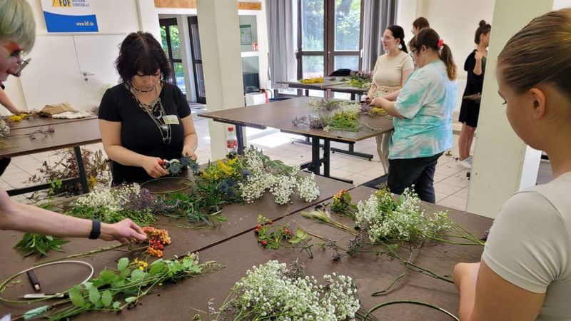Tina-Maria Mohr und Thomas Nordberg, Ausbildungsbeauftragte der IHK Dortmund, gaben einen Einblick in Prüfungsabläufe. NRW-Landesmeister Markus Krudewig hieß die NewComer*innen herzlich Willkommen und erläuterte viel Wissenswertes rund um die Ausbildung. Floristmeisterin Sabrina Meeger leitete einen kleinen Floristik-Workshop an, in dem die Azubis eigene florale Loops kreierten. Eine kreative Gemeinschafts-Erfahrung! Fachlehrerin Ute Lindner von der Berufsschule Dortmund begleitete die Gruppe und hatte den Ausflug zusammen mit Markus Krudewig organisiert. Beide engagieren sich sehr und sind überzeugt vom Konzept der Warm-up-Tage. "Es ist so wichtig, die Berufsanfänger*innen gerade in diesen Zeiten bei der Stange zu halten und sie zu motivieren. Aus diesem Grund setzen wir uns für die Warm-up Tage ein und engagieren uns dafür!", resümierten beide zum Abschluss der Veranstaltung. "Das ist keine Selbstverständlichkeit und eine echte Wertschätzung für den Berufsnachwuchs in der Floristik, die in anderen Branchen in dieser Form nicht stattfindet, lobten die IHK-Vertreter die Aktion!". Die Azubis ihrerseits fanden es richtig gut, sie hatten Fun und viele von ihnen waren begeistert von ihren ersten floralen Loops, die sie im Workshop gestaltet haben. (FDF)