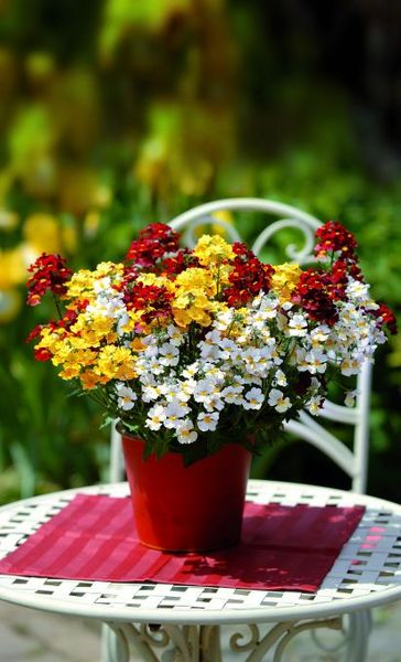 Nemesien wachsen sehr schnell und bilden dabei runde, üppig blühende Blütenkugeln heraus. Das Pflanzentrio Mine-Trine toppt dieses reizvolle Erscheinungsbild noch durch die miteinander ideal harmonierenden Sunsatia plus Sorten in den Farben Rot, Weiß und Gelb.