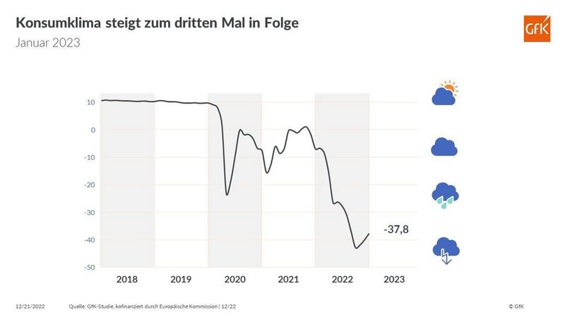 Die GfK prognostiziert für das Konsumklima für Januar 2023 -37,8 Punkte und damit 2,3 Punkte mehr als im Dezember dieses Jahres (revidiert -40,1 Punkte). Dies sind die Ergebnisse der GfK-Konsumklimastudie für Dezember 2022.