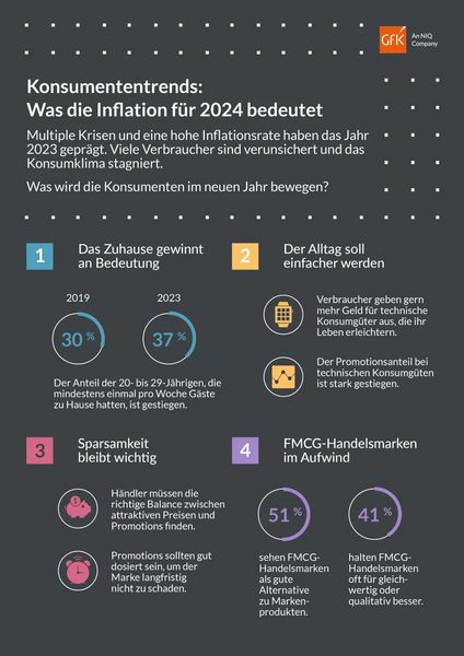 Speziell Ältere und finanziell weniger krisenfeste Menschen ziehen sich ins Zuhause zurück. Damit geht ein Trend zu häuslichen Aktivitäten wie Kochen und Reparaturarbeiten einher. Auch soziale Aktivitäten verlagern sich nach Hause: Während 2019 noch 30% der 20- bis 29-Jährigen mindestens einmal pro Woche Gäste zu Hause hatten, waren es 2023 schon 37%. Das ist vermutlich auch auf Preiserhöhungen in der Gastronomie zurückzuführen und kann sich mit der Mehrwertsteuer-Rückkehr ab Januar 2024 weiter verstärken. Bereits jetzt essen 43% der Deutschen seltener im Restaurant, um zu sparen.