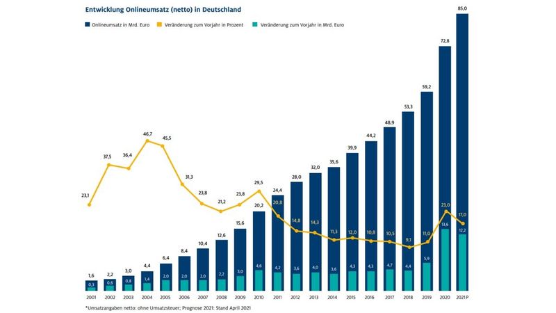 Insgesamt lag der Umsatz des Online-Handels in Deutschland 2020 bei 73 Mrd. Euro. Das bedeutet einen Zuwachs von fast 14 Mrd. Euro bzw. 23% gegenüber dem Vorjahr. (HDE)