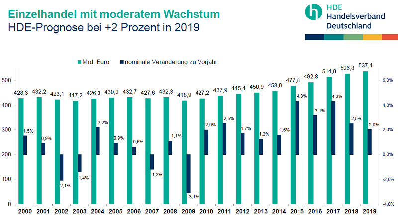 „Der Konsum trotzt der Eintrübung der gesamtwirtschaftlichen Lage, die Verbraucherstimmung ist weiterhin gut“, so HDE-Hauptgeschäftsführer Stefan Genth. Die HDE-Prognose für das laufende Jahr rechnet dementsprechend mit einem Umsatzplus von 2% im Vergleich zum Vorjahr auf dann rund 537 Mio. Euro. Preisbereinigt wird das Umsatzplus rund 0,5% betragen. Dabei wächst der stationäre Einzelhandel um nominal 1,3%, während der Online-Handel seine Erlöse um rund 9% auf 57,8 Mio. Euro erhöht. Damit steht der E-Commerce für fast die Hälfte des absoluten Jahreswachstums im Einzelhandel.
