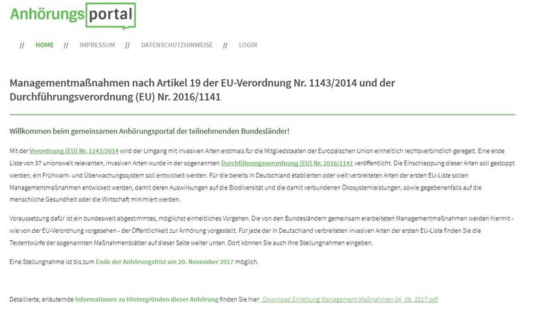 Anregungen und Stellungnahmen willkommen! Das Portal www.anhoerungsportal.de ist bis zum Ende der Anhörungsfrist am 20. November 2017 erreichbar. Dort können direkt Anregungen und Stellungnahmen zum Management der invasiven Arten eingegeben werden. Die Stellungnahmen werden anschließend fachlich ausgewertet und die Managementmaßnahmen werden dann im Frühjahr 2018 durch die zuständigen Bundesländer in Kraft gesetzt.