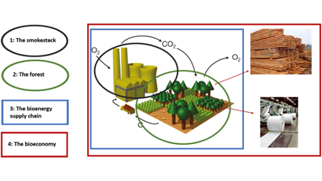 Bei der Nutzung fossiler Brennstoffe erfolgt ein linearer Fluss von Kohlenstoff aus geologischen Speichern in die Atmosphäre. Ein Vergleich der CO2-Emissionen von fossilen Brennstoffen und von Bioenergie am Auspuff oder Schornstein - wie er manchmal vorgenommen wird - übersieht den grundlegenden Unterschied zwischen biogenem und fossilem Kohlenstoff. Denn solange die Holz-Ernte die Kohlenstoffaufnahme des Waldes nicht übersteigt, wie es bei einer nachhaltigen Waldwirtschaft der Fall ist, trägt sie auch nicht zu einem Anstieg der atmosphärischen CO2-Konzentration bei.