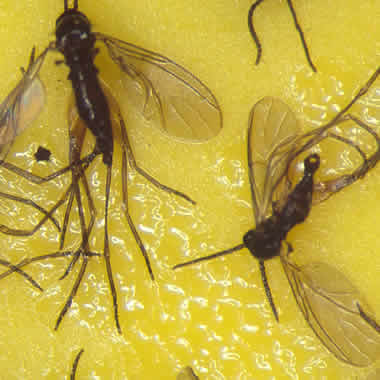 Gelbtafeln sind auch im Hausbereich ein probates Mittel, um die Mücken bei ihrem Hochzeitsflug zu stören. Eine etwa einen Zentimeter dicke Sandschicht auf der Oberfläche des Topfballens hindert sie daran, ihre Eier abzulegen. Sparsam gießen und zwischenzeitlich den Topfballen abtrocknen lassen, missfällt den ungebetenen Gästen. Die Larven sind auf Feuchtigkeit angewiesen und können sich in trockener Umgebung nicht gut entwickeln. Für die Anzucht und Vermehrung von Stecklingen im Gewächshaus gibt es spezielle Bodensubstrate, denen Granulate beigemengt sind, die sie vor einem Larvenbefall schützen.