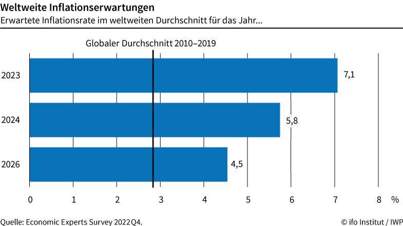 Die Inflationsrate wird im neuen Jahr weltweit 7,1% erreichen, im kommenden Jahr dann 5,8% und 2026 nur noch 4,5% . „Die Erwartungen zum Jahresbeginn sind ermutigend, weil die Experten im Vergleich zum Vorquartal etwas niedrigere Inflationsraten sehen“, sagt ifo-Forscher Niklas Potrafke. „Dennoch bleibt die Inflation auf einem sehr hohen Niveau.“