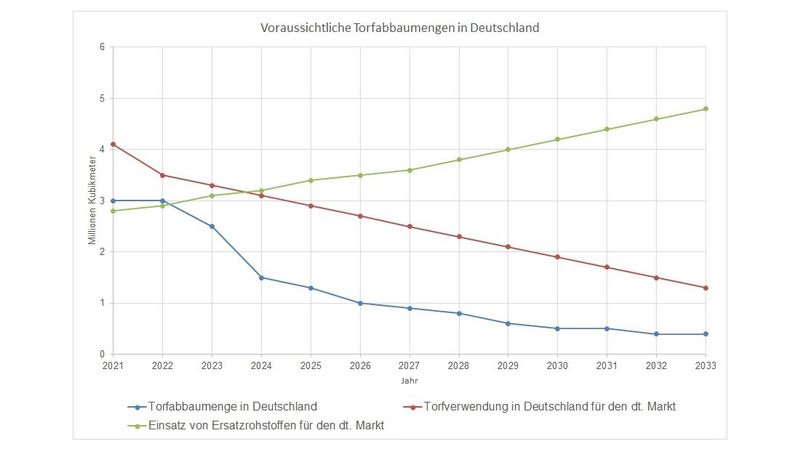 Voraussichtliche Torfabbaumengen in Deutschland der kommenden 10 Jahre in Relation zu anderen Kenngrößen für den deutschen Substratmarkt. Grafik: IVG.