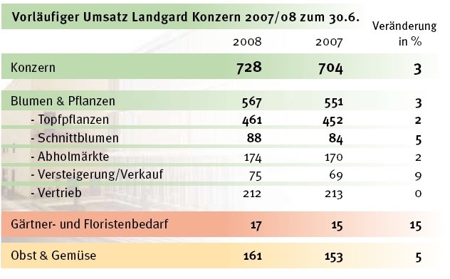 Willi Fitzen stellte den Jahresbericht vor, danach lag der Umsatz des Landgard Konzerns 2007 bei 1,223 Mrd. Euro. Das sind 6% oder 74 Mio. Euro mehr als im Vorjahr. Der Konzernjahresüberschuss betrug im Jahr 2007 6,7 Mio. Euro. Das sind 0,7 Mio. Euro mehr als im Vorjahr 2006 (6,1 Mio. Euro).