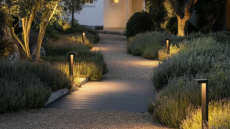 - NILO: Runde Wegeleuchte mit charakteristischem Lichtfenster, das ein gerichtetes, blendarmes Licht erzeugt. Erhältlich in 30 cm und 60 cm Höhe, eignet sich NILO sowohl als einzelnes Gestaltungselement als auch für durchgängige Lichtlinien entlang von Wegen. Mit einem CRI-Wert von 89 sorgt sie für eine besonders natürliche Farbwiedergabe von Pflanzen und Materialien.