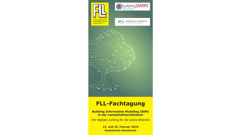 Die Forschungsgesellschaft Landschaftsentwicklung Landschaftsbau e. V. (FLL) veranstaltet am 15. und 16. Februar 2024 nun bereits zum dritten Mal eine Fachtagung zum Thema Building Information Modeling (BIM). Diese 3. BIM-Fachtagung wird an der Hochschule Osnabrück zusammen mit den Kooperationspartnern Hochschule Osnabrück und buildingSMART Deutschland als zweitägige Präsenz-Fachtagung zum Thema „BIM in der Landschaftsarchitektur – Der digitale Zwilling für die Grüne Branche“ durchgeführt.
