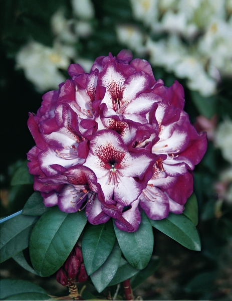Das satt dunkelgrüne, seidenmatt glänzende Laub ist rötlich gestielt, länglich oval, zur Spitze hin etwas nach unten gebogen und unterstreicht mit seiner regelmäßigen Form die Gesundheit dieser Sorte. Der Wuchs ist breitaufrecht, etwas locker, durch dezenten Rückschnitt nach der Blüte aber gut kompakt zu halten. 10-jährig etwa 130 cm hoch und 150 cm breit. Gut winterhart bis –22°C.