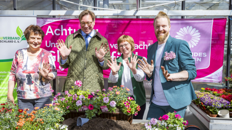 V.l.n.r.: Ute Franke (Vorstandsmitglied Bundesverband der Einzelhandelsgärtner und Fachgruppenvorsitzende der Einzelhandelsgärtner im Gartenbauverband Mitteldeutschland e.V.), Georg-Ludwig von Breitenbuch (Sächsischer Staatsminister für Umwelt und Landwirtschaft), Antje May (Gärtnerei Gruschwitz), Hannes Schrader (Deutsche Blumenfee), bepflanzen gemeinsam einen Balkonkasten. Bild: © Marko Förster / Gartenbauverband Mitteldeutschland e.V.