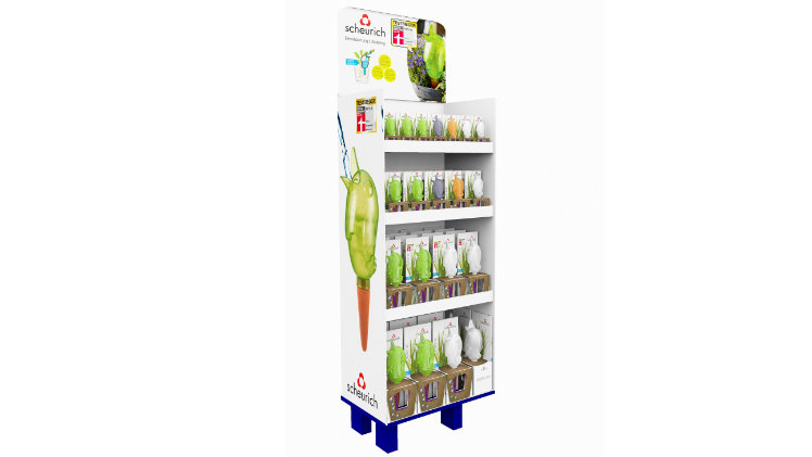Sympathischer Überflieger am POS: Bei dem neuen Regaldisplay von Scheurich dreht sich alles um den beliebten Bewässerungshelfer Bördy, dessen XL-Ausführung als Gruppensieger bei Stiftung Warentest (Ausgabe 06/2017) überzeugte.