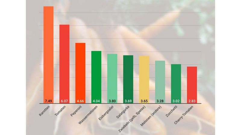 Auf Rang 2 folgen die Tomaten. Würde man die Cherry-Tomaten hinzuzählen, würden sie gar die Karotte von der Spitzenposition verdrängen.