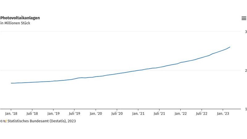 Wie das Statistische Bundesamt (Destatis) mitteilt, waren im März 2023 auf Dächern und Grundstücken hierzulande gut 2,6 Mio. Photovoltaikanlagen mit einer Nennleistung von insgesamt rund 70.600 Megawatt installiert. Damit nahm die Zahl der Anlagen gegenüber dem Vorjahresmonat um 16% zu, die installierte Leistung stieg im selben Zeitraum um 21%. Im März 2022 hatte es gut 2,2 Mio. Photovoltaikanlagen mit einer Nennleistung von insgesamt knapp 58.500 Megawatt gegeben. Erfasst werden alle Photovoltaikanlagen, die in die Netze der öffentlichen Versorgung einspeisen und über einen Stromzähler verfügen, der die eingespeisten Strommengen misst. Kleinere Anlagen, wie etwa die sogenannten Balkonkraftwerke, fallen daher in der Regel nicht darunter.