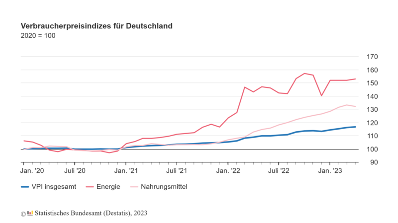 Im Vergleich zum März 2023 stieg der Verbraucherpreisindex im April 2023 um 0,4%. Teurer wurden unter anderem Bekleidungsartikel (+1,8%) und Übernachtungen (+1,6%). Auch die Preise für Energie insgesamt zogen an (+0,7%), trotz Preisbremse insbesondere für Fernwärme (+3,3%). Auch Kraftstoffe insgesamt wurden teurer (+1,6%, darunter Superbenzin: +2,8%, dagegen Dieselkraftstoff: -2,1%). Günstiger als einen Monat zuvor waren leichtes Heizöl (-3,1%) und Erdgas (-0,3%). Auch für Nahrungsmittel insgesamt mussten die privaten Haushalte im Vormonatsvergleich etwas weniger bezahlen (-0,8%). Hier gingen vor allem die Preise für Gemüse (-7,5%, darunter frisches Gemüse: -10,0%) sowie für Speisefette und Speiseöle (-3,0%, darunter Sonnenblumenöl, Raps oder Ähnliches: -8,2%; Butter: -3,6%) zurück. (destatis)