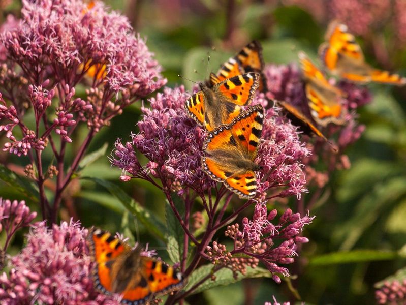Riese für Schmetterlinge: Nicht nur der Kleine Fuchs fliegt förmlich auf den Pur-purdost (Eupatoria fistulosum). Wenn sich die Blüten von August bis Oktober öffnen, wird das Beet zum Treffpunkt für diverse weitere Tagfalter sowie Hummeln, Schweb-fliegen und Bienen. Die bis zu zwei Meter hoch aufragende Staude ist als Solitär im Beet oder am Teichrand gut aufgehoben und wächst an einem sonnigen bis halbschattigen Standort. Purpurdost wird nicht umsonst auch Wasserdost genannt – er braucht einen feuchten Boden. Bild: GMH/Erich Luer.