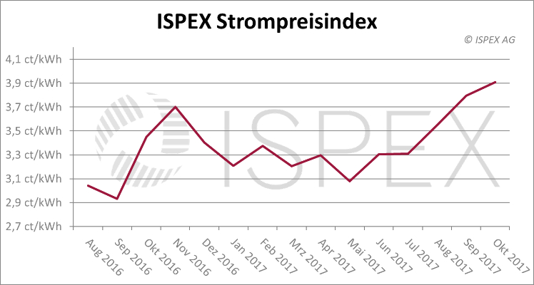 Im Oktober sahen sich die Unternehmen erneut mit schlechteren Strompreisangeboten konfrontiert. Grund dafür war die Entwicklung an den Handelsplätzen. Verglichen mit September verzeichnete der ISPEX-Strompreisindex eine Erhöhung um etwa 0,10 Cent je Kilowattstunde auf aktuell 3,908 Cent je Kilowattstunde. Diesen Höchststand gab es am Markt das letzte Mal im vierten Quartal des Jahres 2014. Nimmt man das Preisniveau des diesjährigen Monats Mai mit seinem Tiefststand, beträgt die Erhöhung mittlerweile 0,80 Cent je Kilowattstunde.