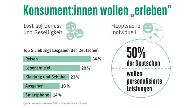 Nach den Ergebnissen des aktuellen Konsumbarometers 2025 von Consors Finanz suchen Europäer:innen zunehmend nach anderen Formen des Genusses und haben andere Shoppingziele. So wollen 36% der Deutschen heute mehr immaterielle Güter konsumieren als vor zehn Jahren. Gemeint sind beispielsweise Events, Urlaube oder Online-Dienste. Die Kaufquote von materiellen Dingen hingegen ist nur bei 32% der Befragten gestiegen. In Europa liegt das Verhältnis bei 43 zu 37% (Immaterielles/Materielles).