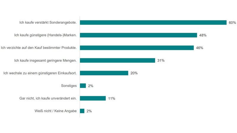 Wie eine aktuelle und vom Handelsverband Deutschland (HDE) in Auftrag gegebene Umfrage zeigt, schränkt sich die Mehrheit der Verbraucherinnen und Verbraucher beim Einkaufen ein. Demnach geben 60% an, beim Lebensmittelkauf verstärkt Sonderangebote zu nutzen, 46% verzichten auf den Kauf bestimmter Produkte und knapp ein Drittel kauft insgesamt geringere Mengen. (HDE)