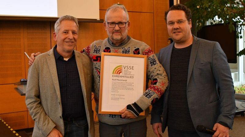 Nach 29 Jahren Vorstandsarbeit wurde Rolf Meinhardt, stellvertretender Vorstandssprecher, durch Wolfgang Böser, VSSE-Gründungsmitglied, und Simon Schumacher, VSSE-Vorstandssprecher, verabschiedet. In seiner Laudatio hob Wolfgang Böser die Leistungen von Rolf Meinhardt für die Branche hervor. Er hat bereits in den 80er Jahren im Arbeitskreis Spargel Südhessen mit Infoveranstaltungen zu Saisonarbeitskräften und der Fax-Info-Börse den Weg zum VSSE bereitet. Durch jährliche Saisoneröffnungen mit z.B. der längsten Spargeltheke der Welt oder der Spargelpyramide hat er für eine große Medienpräsenz der Branche gesorgt. Er war Mitinitiator des heutigen Messeduos expoSE & expoDirekt, förderte die Spargel-Versuche am Queckbrunnerhof und setzte sich für Feldrundfahrten ein.