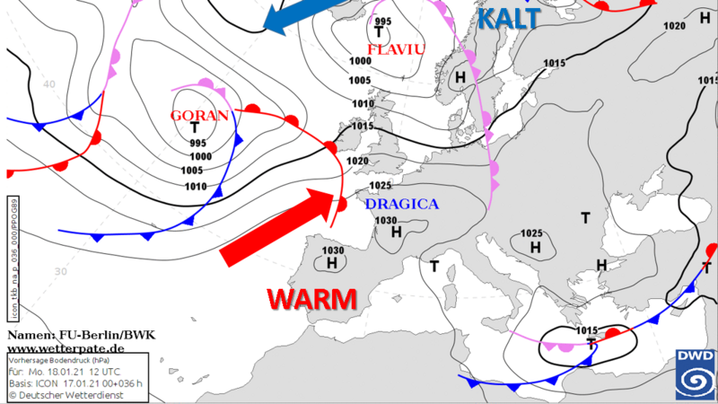 Nun wurden zumindest vorläufig die Weichen in der Wetterküche auf "mild" bis "sehr mild" und "zeitweise nass" umgestellt. Die Kälte ist also auf dem Rückzug. Dank des Zusammenspiels zwischen dem Hoch DRAGICA mit Schwerpunkt über Südwesteuropa und den Tiefdruckgebieten FLAVIU und GORAN mit dem jeweiligen Kern über dem Nordmeer bzw. Nordatlantik wird in den nächsten Tagen mit einer westlichen bis südwestlichen Grundströmung milde bis sehr milde Meeresluft nach Deutschland geführt. Die Abbildung zeigt die Lage der Hoch- und Tiefdruckgebiete mit den zugehörigen Fronten (blaue Kaltfront, rote Warmfront, lila Mischfront).