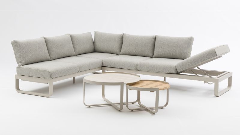 Helle Farbtöne erobern zunehmend den Outdoor-Bereich und verleihen jeder Terrasse ein frisches, elegantes Flair. Ab sofort präsentiert sich die modulare FLY Lounge auch in einer trendigen hellen Variante: Das in light taupe pulverbeschichtete Aluminiumgestell harmoniert perfekt mit dem hochwertigen Polsterbezug im edlen Farbton cashmir. Die Lounge strahlt Leichtigkeit und Stil gleichermaßen aus. Die Kissen sind dabei nicht nur schön anzusehen, sondern auch für das wahre Outdoor-Leben gemacht – pflegeleicht, wasserabweisend und UV-beständig. Das 2er-Tischset ergänzt das Lounge-Ensemble perfekt: Der runde Tisch mit 60 cm Durchmesser verfügt über eine edle Teakholz-Platte, während die 80-cm-Variante mit einer Keramik-Tischplatte in der Farbe dune ausgestattet ist.