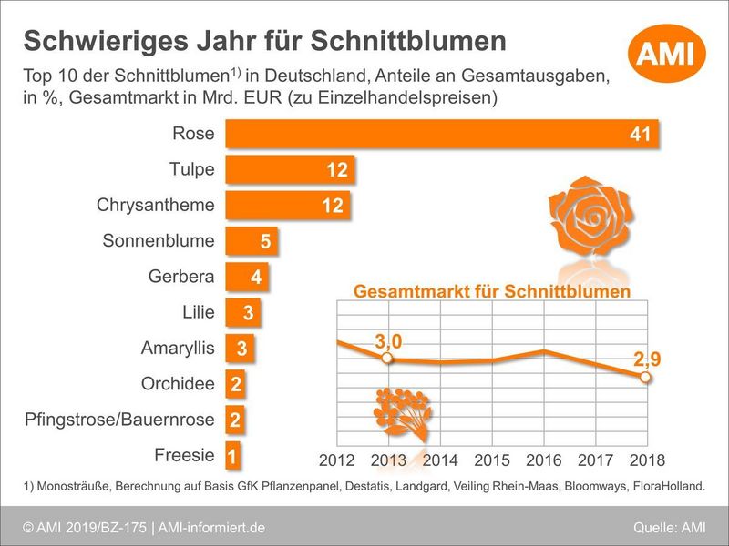 Laut Marktdaten der Agrarmarkt Informations-Gesellschaft (AMI), die der Zentralverband Gartenbau e. V. (ZVG) mit seinen Bundesfachverbänden Bundesverband Zierpflanzen (BVZ) und Bundesverband Einzelhandelsgärtner (BVE) in Auftrag gegeben hatte, stieg das Marktvolumen auf gut 8,7 Mrd. Euro zu Einzelhandelspreisen. Dies ist ein Plus von rund 1% zum Vorjahr und führt zu einem Marktniveau wie im Jahr 2016. Dies spiegelt sich auch in den durchschnittlichen Pro-Kopf-Ausgaben wider. Knapp 105 Euro gab jeder Verbraucher in Deutschland 2018 durchschnittlich für Blumen und Zierpflanzen aus.
