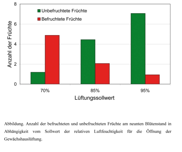 In einem Experiment mit Lüftungssollwerten von 24, 30 und 33 °C zeigte sich, dass bereits bei einem Lüftungssollwert von 30 °C der Fruchtansatz fast vollständig ausblieb. Verantwortlich sind dafür wahrscheinlich die sehr hohen Luftfeuchtigkeiten – eine Entfeuchtungslüftung erfolgte nicht. In einem Folgeexperiment wurde deshalb die Wirkung der Luftfeuchtigkeit untersucht. Dabei wurde mit Beginn der Blüte des vierten Blütenstandes die Lüftung am Tage bei Überschreiten einer relativen Luftfeuchtigkeit von 70, 85 beziehungsweise 95% geöffnet. In der Nacht betrug der Sollwert in allen Varianten zur Vermeidung von Blattkrankheiten 75% und der Lüftungssollwert für die Temperatur Tag und Nacht 30 °C. Zur Befruchtung wurden die Blütenstände zweimal wöchentlich gerüttelt. Die Varianten zeigten keine Wirkung auf die Photosynthese der Bestände und auch nicht auf den Ertrag, solange Früchte geerntet wurden, welche vor der Einstellung der extremen Varianten befruchtet wurden.