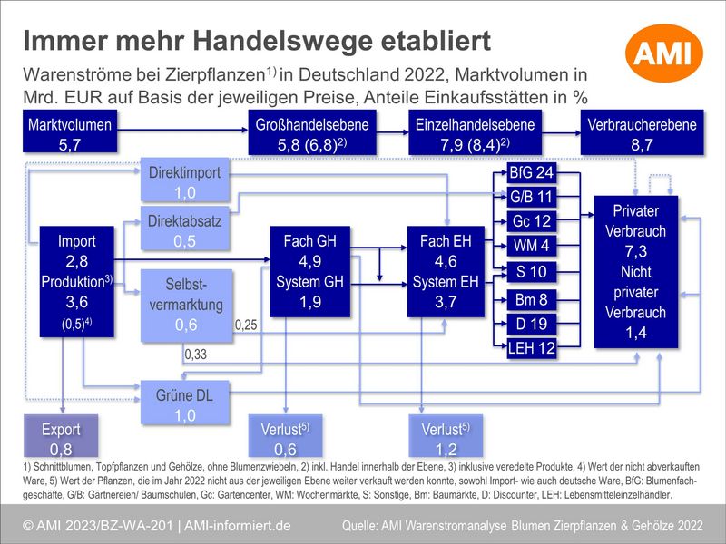 Die Agrarmarkt Informations-Gesellschaft (AMI) hatte im Auftrag des ZVG und des Bundeslandwirtschaftsministeriums mit Unterstützung des Verbandes des Deutschen Blumen- Groß- und Importhandels (BGI) und des Blumengroßmarktes Köln die Warenströme für Blumen, Zierpflanzen und Gehölze im Jahr 2022 analysiert. Bei den Ergebnissen handelt es sich um fundierte Schätzungen und Hochrechnungen, die nur in Teilen mit den Ergebnissen aus 2018 vergleichbar sind. So erhöhte sich für Topfpflanzen die Produktionsleistung im Vergleich zur Vorgängerstudie deutlich. Das ist vor allem darauf zurückzuführen, dass erstmals Produktveredlung wie Übertöpfe und Deko berücksichtigt wurden, wenn sie bereits in den Produktionsbetrieben erfolgte und dann über die Handelsstufen durchgereicht wurden. (ZVG)