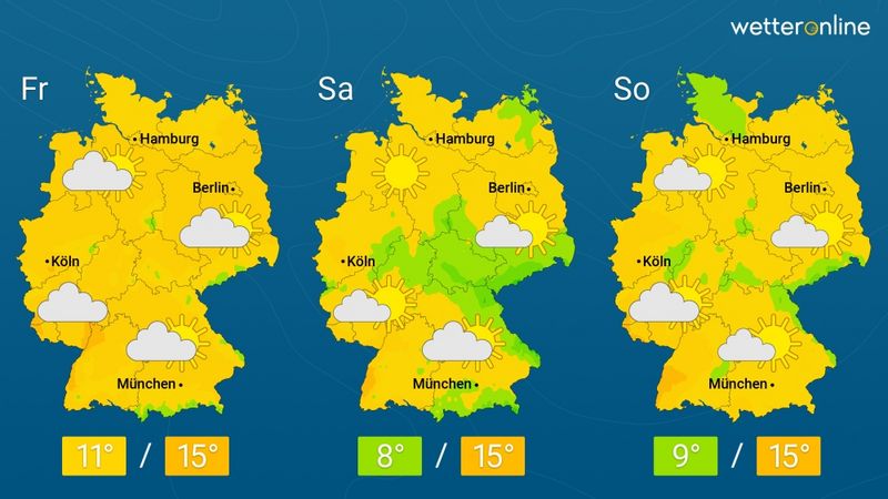 Nach einem in vielen Regionen immer noch recht trüben Freitag kommt am Wochenende die Sonne wieder mehr zum Zuge. Vor allem für Samstag kündigt sich nach Nebelauflösung vielerorts schön sonniges Wetter an. In einigen Flusstälern bleibt es jedoch länger trüb. Durch die trockenere Luft und häufiger klaren Nachthimmel kühlt es nachts viel mehr ab. Tagsüber liegen die Höchstwerte mit nur noch 9 bis 12 Grad ebenfalls etwas niedriger.