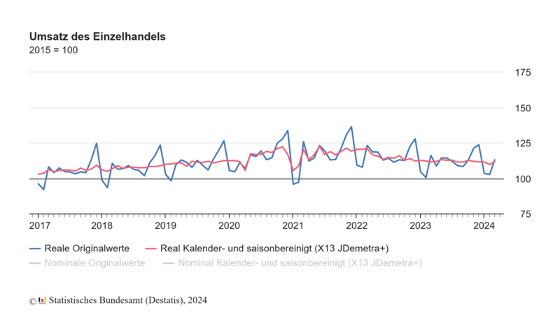 Im Vergleich zum Vorjahresmonat März 2023 verzeichnete der Einzelhandel ein Umsatzplus von real 0,3% und nominal 2,1%. Die Differenz zwischen den nominalen und realen Ergebnissen spiegelt das gestiegene Preisniveau im Einzelhandel wider.