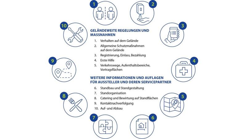 Für die Aussteller gibt das Hygienekonzept „Safe-Business“ konkrete Hilfestellung zur Gestaltung von Messeständen: Stände sollten grundsätzlich offen und kommunikativ gestaltet sein. Dies schafft einen guten Überblick für die Besucher und eine angenehme Gesprächsatmosphäre. Die großflächigen Kommunikationsflächen lassen sich dann einfach in Zonen unterteilen, die so eine gleichmäßige Verteilung der Besucher gewährleistet. Hier wird die DLG die Aussteller in der Planung von Standkonzepten vorab auch gern unterstützen. Die Wege zwischen den Standflächen werden in einigen Hallen breiter sein müssen als bisher, um die Abstandsregelungen zwischen den Besuchern zu ermöglichen. Weiterhin arbeitet die DLG an einem neuen Ticketing-Konzept, so dass sich die Besucheranzahl gleichmäßig auf alle Messetage verteilt und eine Maximalzahl nicht überschritten wird.