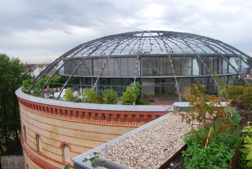 Angesichts des massiven Bunkerunterbaus und einer 3m dicken Stahlbetondecke bestanden keine Probleme mit Lasten, doch der Erhalt der Schwedlerkuppel stellte ein logistisches Problem für die Konstruktion und den Bauprozess dar. Nur maximal zwei Felder der 32 radialen Sparren konnten temporär entfernt werden, was eine Konstruktion mit Fertigteilen verbot. Das gesamte Baumaterial wurde daher Stück für Stück mit einem Kran durch die Kuppelöffnung auf die Baustelle auf dem Dach gehievt. Dies geschah ebenso bei allen Materialien für die geplanten Grünflächen.