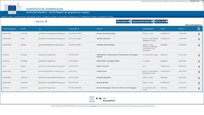 Wer selbst einmal nachschauen möchte, ob dieses oder jenes Produkt ein Siegel trägt, der wird in der jüngst aktualisierten Datenbank eAmbrosia der Europäischen Kommission fündig. Die Menüführung ist zugegebenermaßen nicht ganz einfach. Man muss sich durch ein Untermenü arbeiten: