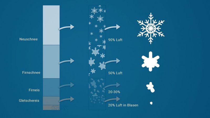 Sobald Schneeflocken auf Bäume, Dächer oder den Boden fallen und eine Schneedecke bilden, verändern sich diese. Eine pulvrige Schneedecke aus feinen sechsstrahligen Kristallen und Luft hat mit etwa 30kg pro Kubikmeter die geringste Dichte. Wird diese Schneedecke durch Wind verfrachtet, brechen die feinen Verästelungen der einzelnen Kristalle. Die luftgefüllten Hohlräume in der Schneedecke werden kleiner und der Schnee kompakter. Er erreicht dann schon eine Dichte von etwa 50kg pro Kubikmeter. Schmelzprozesse beschleunigen die Veränderung des Schnees. Durch mehrmaliges Frieren und Tauen nimmt die Dichte der Schneedecke immer weiter zu und erreicht bei Altschnee nach einigen Tagen Werte von 200 bis 500kg pro Kubikmeter. Auf einem nur 100 Quadratmeter großen Dach lastet somit ein zusätzliches Gewicht von bis zu 50 Tonnen Schnee.