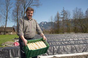 Schweizer Spargel schlummert in diesem Jahr länger als üblich im Boden. Zwei bis drei Wochen mehr dürften es als Folge der ungewohnten Frühlingskälte sein. Trotz der plötzlichen Temperaturexplosion Mitte April dauerte es noch bis zum endgültigen Start der Spargelsaison. Zu einer Vorpremiere kam es aber in Diepoldsau, wo Stefan Britschgi vom Fahrmaadhof bereits in der vierten Aprilwoche mit der Erntekampagne startete. Schon ein paar Tage früher präsentierte er stolz die erste Kiste mit frischgestochenem Spargel. Vermutlich war es der erste im ganzen Land.